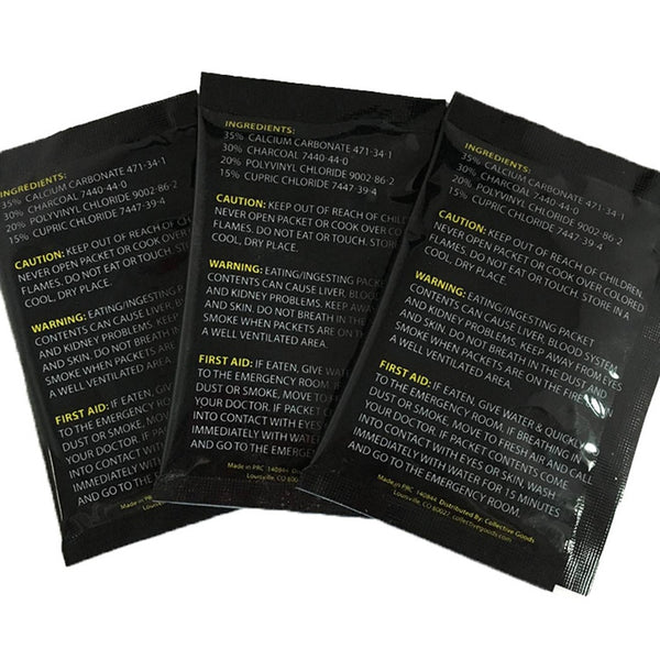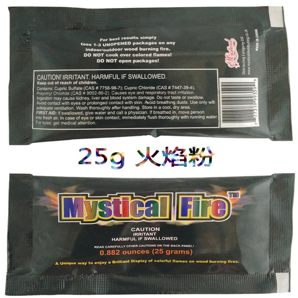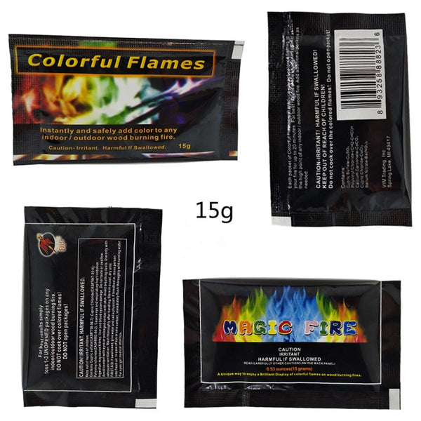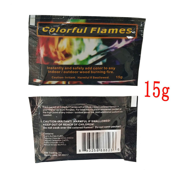 cette poudre de flamme de couleur est une sorte de matériau de fête qui permet de transformer la couleur de la flamme en couleur. Il convient pour ajouter une atmosphère au feu de joie sauvage pendant le festival ou le feu de camps. Le principe du produit est de colorer la flamme en ajoutant différents éléments. Chaque fois que tu mettra le produit dans le feu, tu pourras voir la flamme en magnifique couleurs (faibles ou vives bleu violet rouge vert jaune et autres). Elle peut être utilisée avec du bois brûlant à l'intérieur comme à l'extérieur ainsi qu'avec d'autres flammes de combustible. Selon la force de la flamme, la durée est d'environ dix minutes ou dizaines de minutes, sûr et respectueux de l'environnement. Habituellement, les enfants peuvent jouer avec